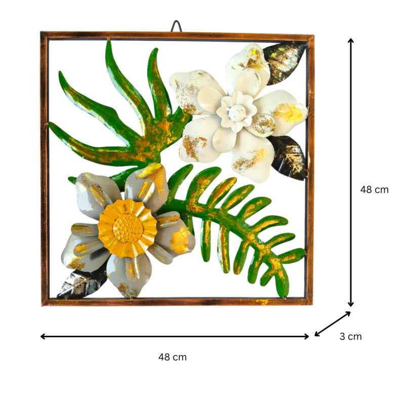Apne ghar ki deewaron ko ek modern aur sophisticated touch dein is Handcrafted 3D Floral Wall Frame ke saath. Is art piece mein khubsurat white flowers aur vibrant green leaves ka combination hai, jise gold foil accents ke saath finish kiya gaya hai. Yeh metal wall sculpture apne unique 3D design ki wajah se deewar par ek depth aur luxury feel create karta hai.
