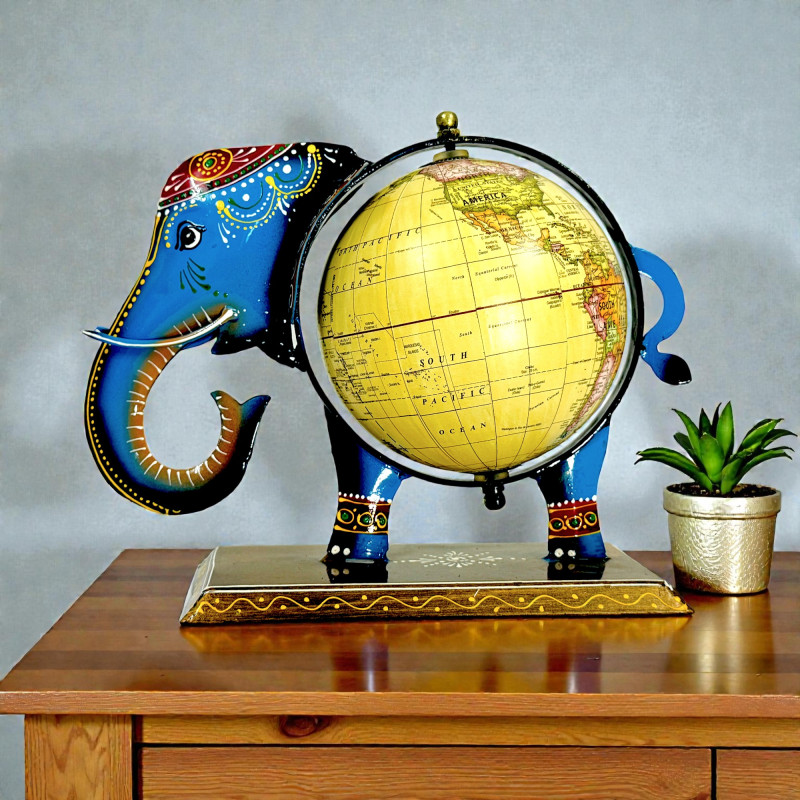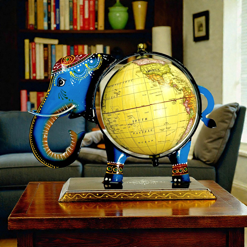 Apne workspace ko ek royal aur intellectual look dein is Unique Elephant Design World Globe ke saath. Isme ek detailed rotating globe ko ek majestic blue elephant ki body ke andar set kiya gaya hai. Yeh metal decorative piece Indian traditional art aur modern utility ka ek perfect mel hai, jo aapke desk par sabka dhyan khinch lega.