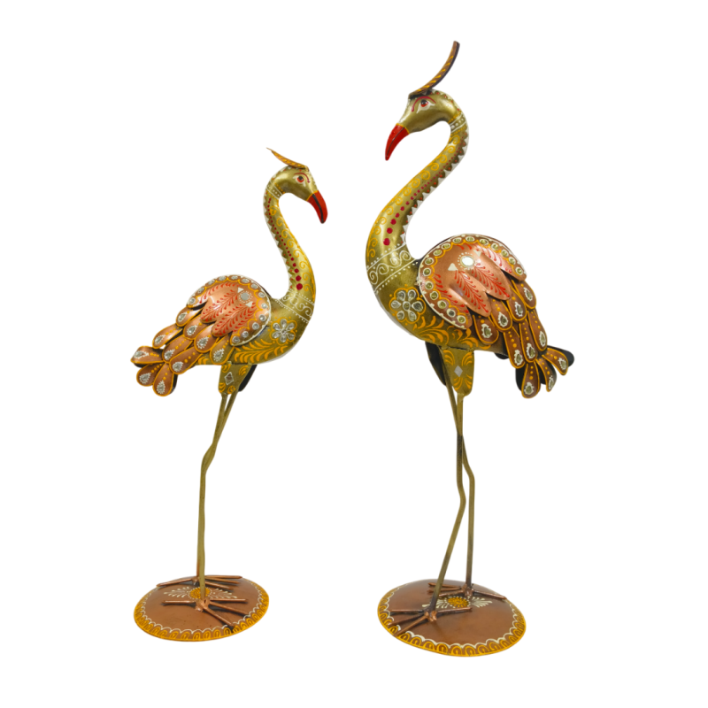 Apne ghar mein elegance aur royalty laayein is Handcrafted Metal Crane Pair ke saath. Is set mein do lambe (tall) aur gracefully design kiye gaye Saras bird statues hain jo traditional Indian art ko darshate hain. Yeh metal showpiece set apne golden hue aur intricate hand-painted details ki wajah se aapke living room, entryway ya office space ko ek premium look deta hai.